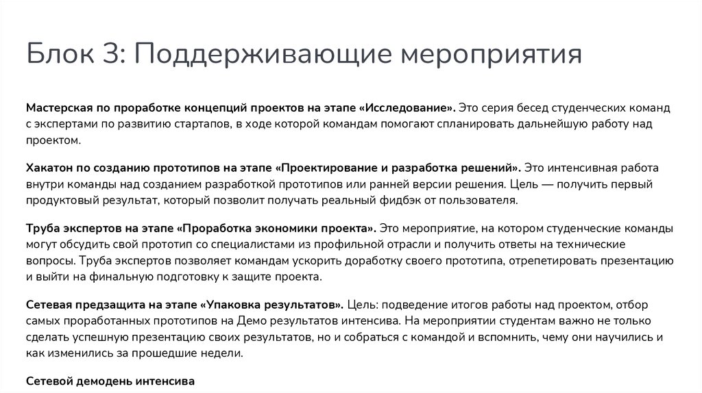 Блок 3: Поддерживающие мероприятияМастерская по проработке концепций проектов на этапе «Исследование». Это серия бесед студенческих команд