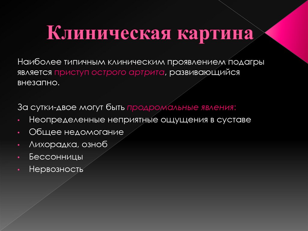 Наиболее типичным клиническим проявлением подагрыявляется приступ острого артрита, развивающийся
