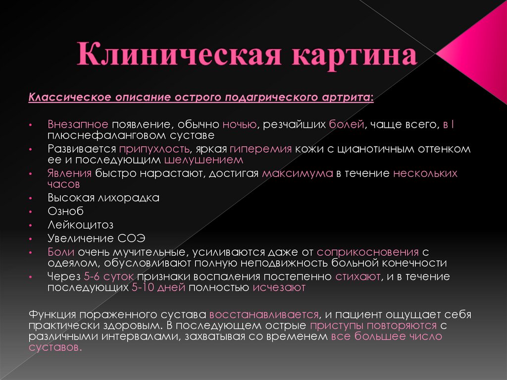 Классическое описание острого подагрического артрита:Внезапное появление, обычно ночью, резчайших болей, чаще всего, в I