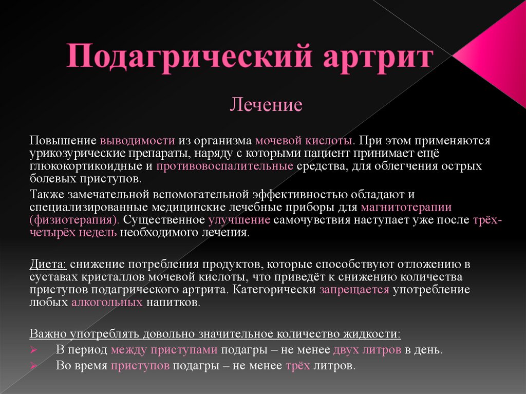 ЛечениеПовышение выводимости из организма мочевой кислоты. При этом применяются