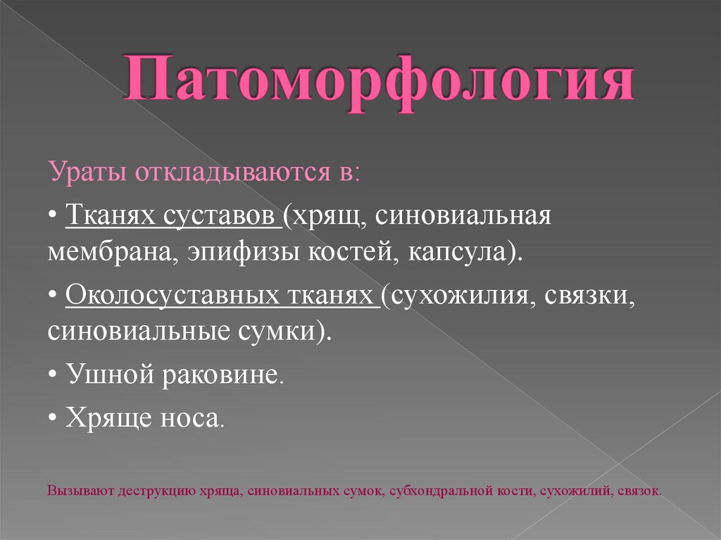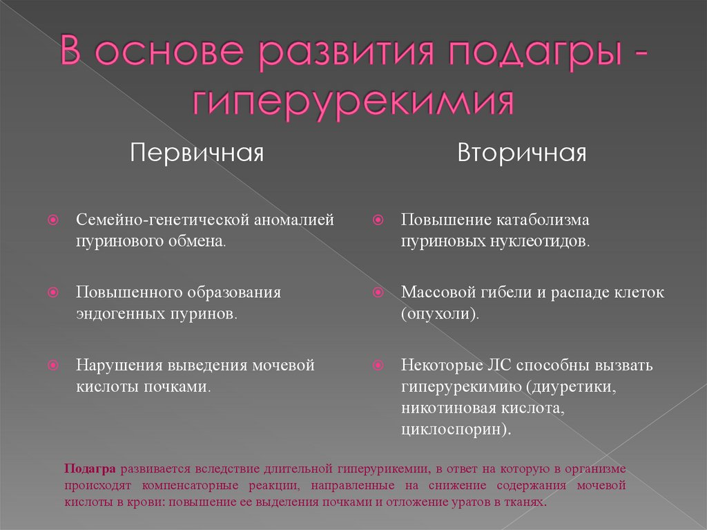 кислоты в крови: повышение ее выделения почками и отложение уратов в тканях.