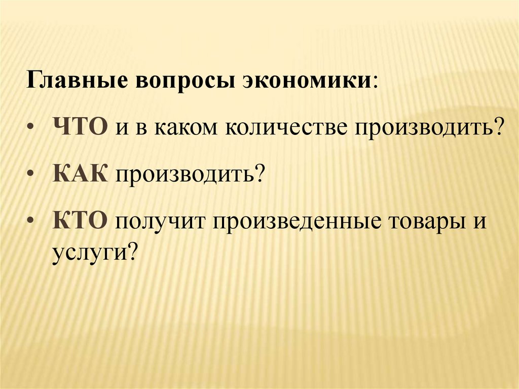 Главные вопросы экономики:• ЧТО и в каком количестве производить?