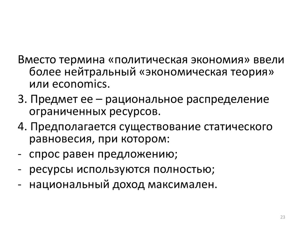 Вместо термина «политическая экономия» ввелиболее нейтральный «экономическая теория»
