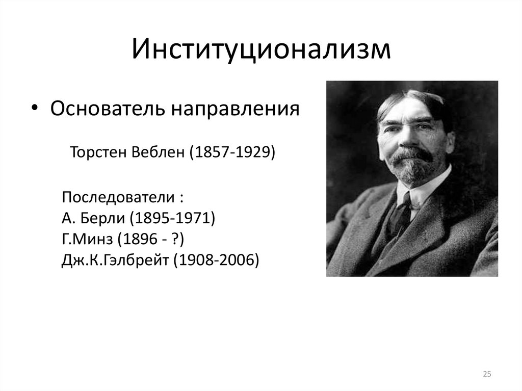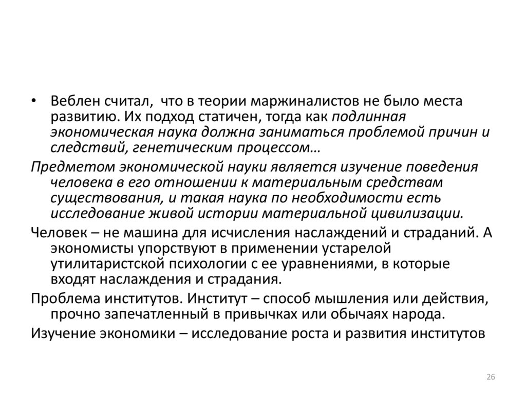 • Веблен считал, что в теории маржиналистов не было местаразвитию. Их подход статичен, тогда как подлинная