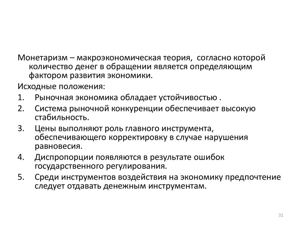 Монетаризм – макроэкономическая теория, согласно которойколичество денег в обращении является определяющим