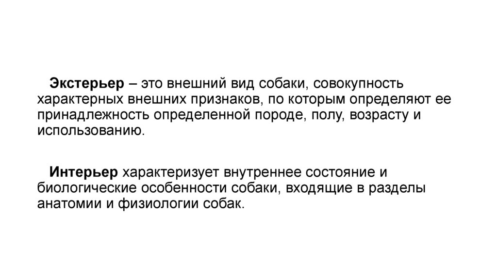 Экстерьер – это внешний вид собаки, совокупностьхарактерных внешних признаков, по которым определяют ее