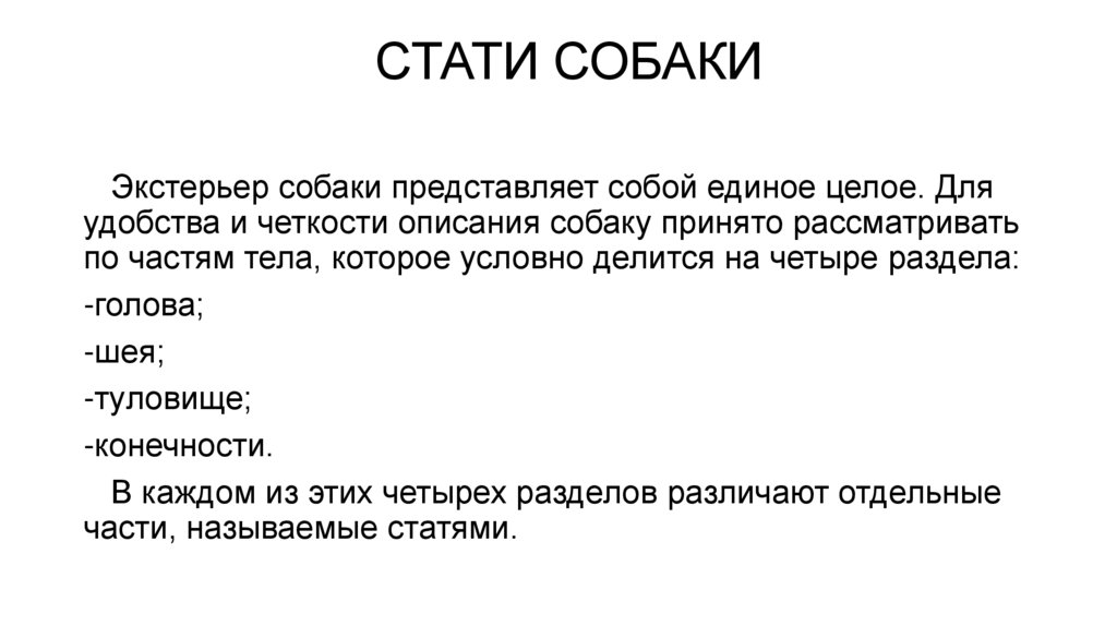 СТАТИ СОБАКИЭкстерьер собаки представляет собой единое целое. Для