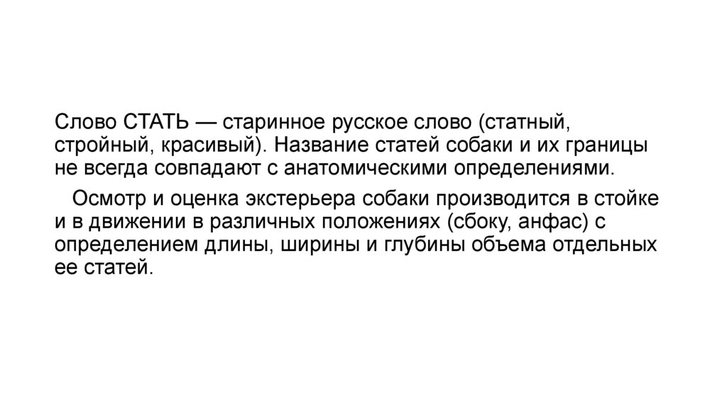 Слово СТАТЬ — старинное русское слово (статный,стройный, красивый). Название статей собаки и их границы