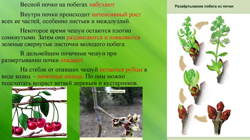 Весной почки на побегах набухают.Внутри почки происходит интенсивный рост