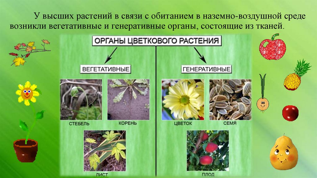 У высших растений в связи с обитанием в наземно-воздушной средевозникли вегетативные и генеративные органы, состоящие из тканей.