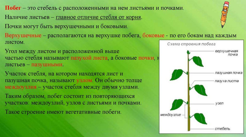 Побег – это стебель с расположенными на нем листьями и почками.Наличие листьев – главное отличие стебля от корня.