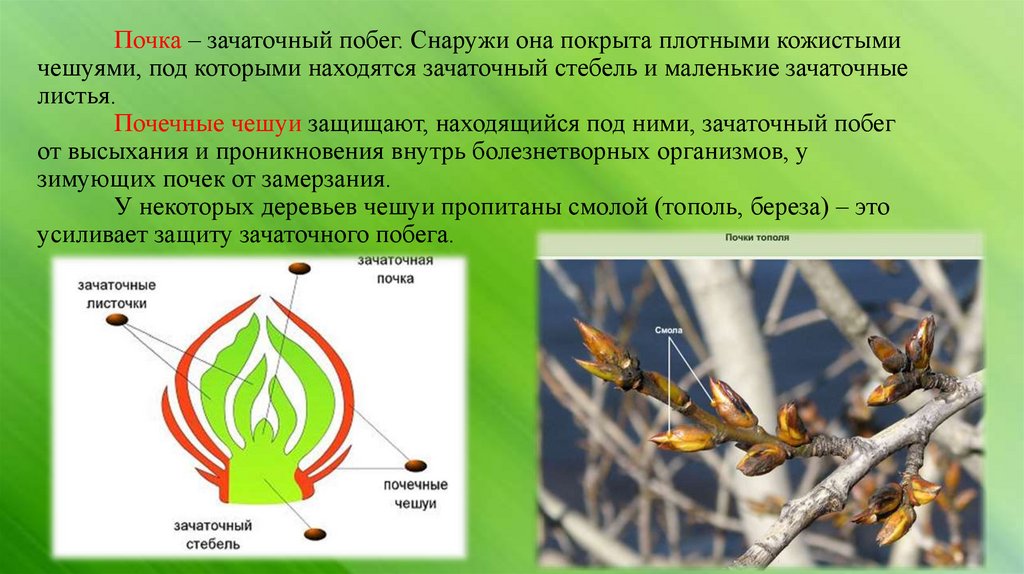 Почка – зачаточный побег. Снаружи она покрыта плотными кожистымичешуями, под которыми находятся зачаточный стебель и маленькие зачаточные