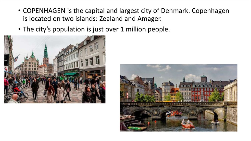 • COPENHAGEN is the capital and largest city of Denmark. Copenhagenis located on two islands: Zealand and Amager.