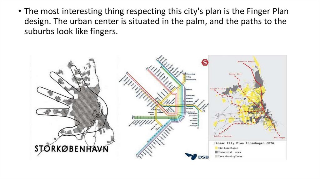 • The most interesting thing respecting this city's plan is the Finger Plandesign. The urban center is situated in the palm, and the paths to the