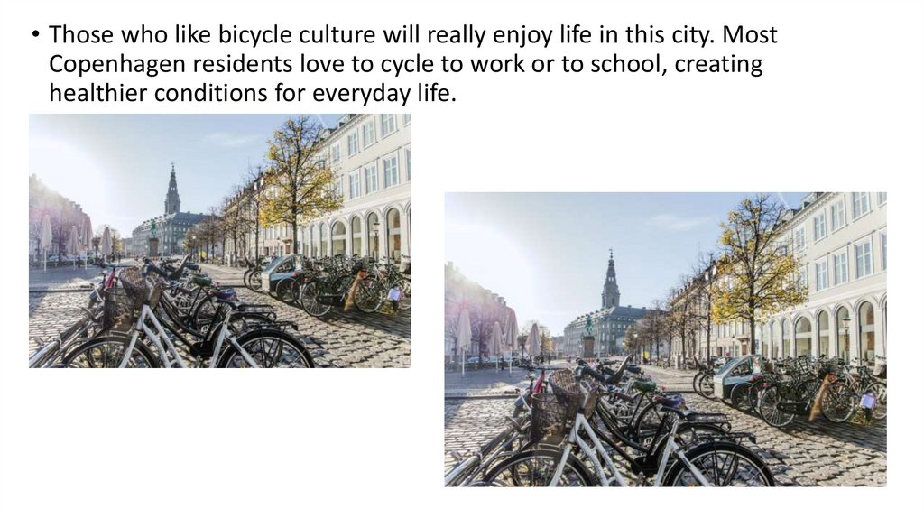 • Those who like bicycle culture will really enjoy life in this city. MostCopenhagen residents love to cycle to work or to school, creating