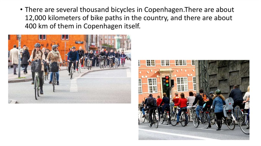 • There are several thousand bicycles in Copenhagen.There are about12,000 kilometers of bike paths in the country, and there are about