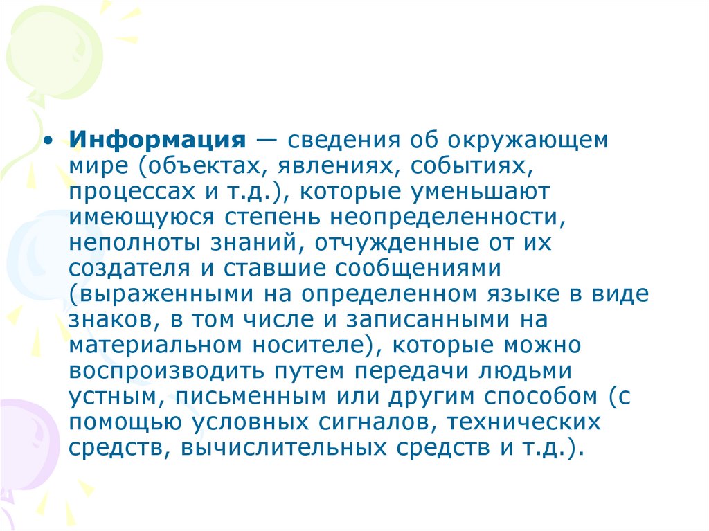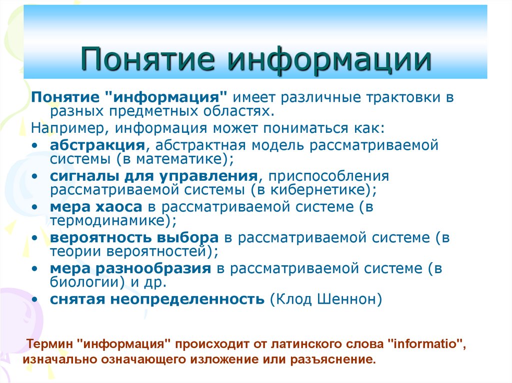 Понятие информацииПонятие "информация" имеет различные трактовки в