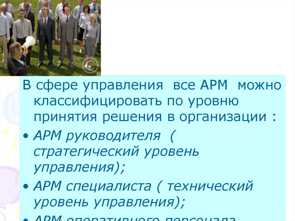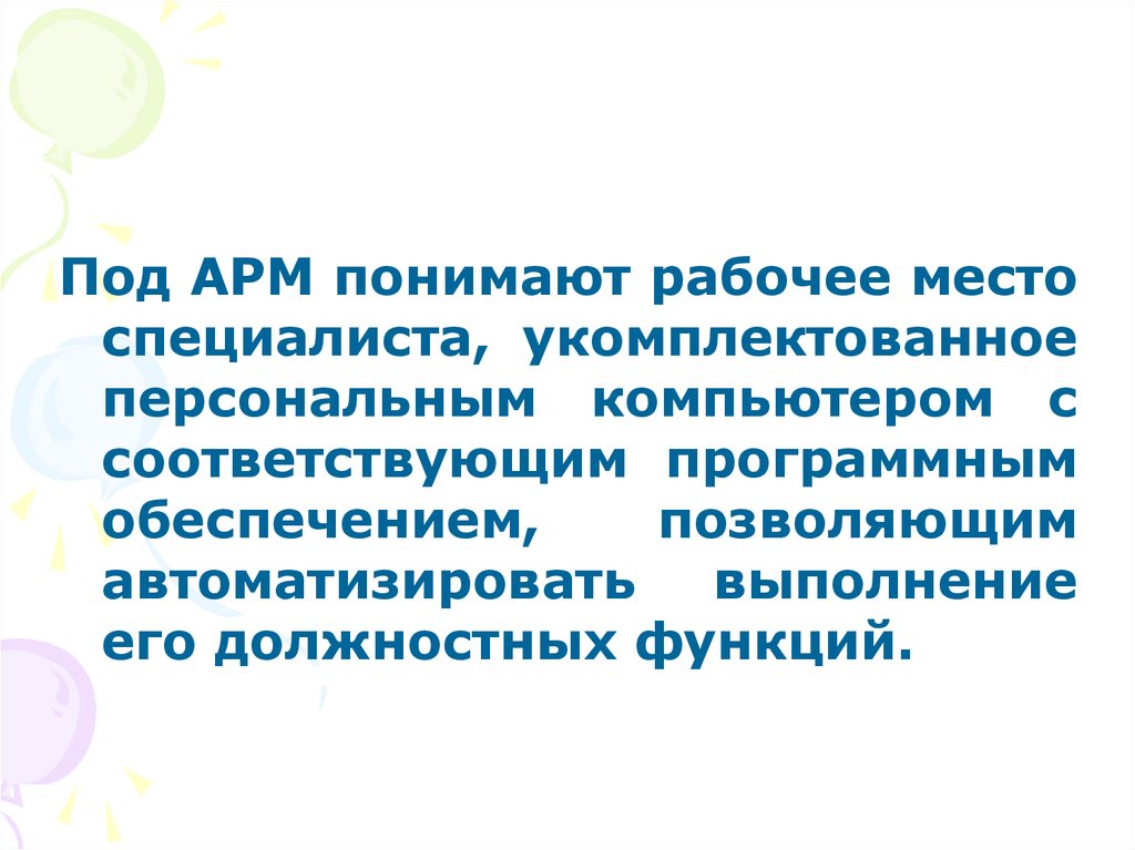 Под АРМ понимают рабочее местоспециалиста, укомплектованное