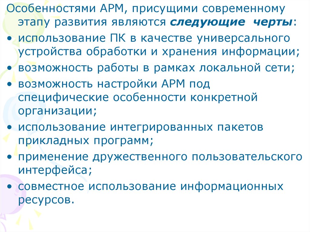 Особенностями АРМ, присущими современномуэтапу развития являются следующие черты: