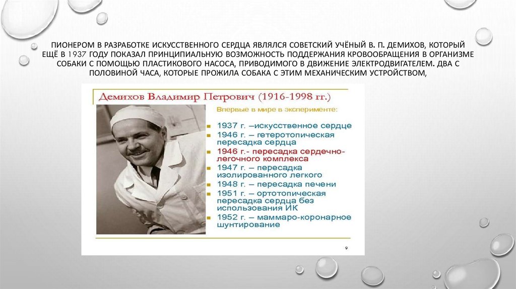 ПИОНЕРОМ В РАЗРАБОТКЕ ИСКУССТВЕННОГО СЕРДЦА ЯВЛЯЛСЯ СОВЕТСКИЙ УЧЁНЫЙ В. П. ДЕМИХОВ, КОТОРЫЙЕЩЁ В 1937 ГОДУ ПОКАЗАЛ ПРИНЦИПИАЛЬНУЮ ВОЗМОЖНОСТЬ ПОДДЕРЖАНИЯ КРОВООБРАЩЕНИЯ В ОРГАНИЗМЕ