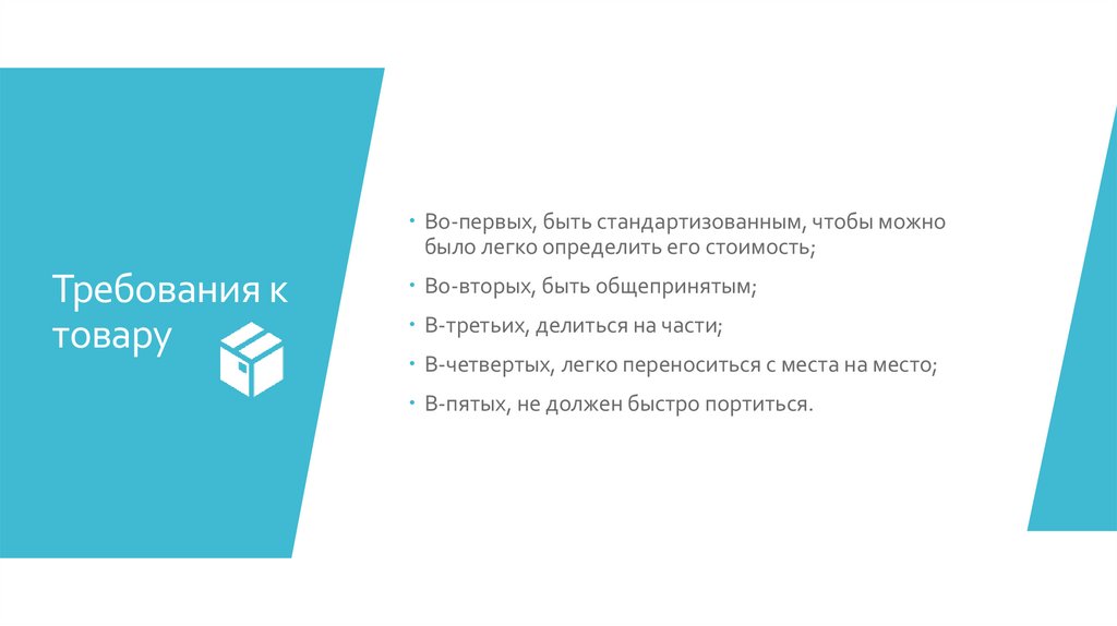 Во-первых, быть стандартизованным, чтобы можнобыло легко определить его стоимость;