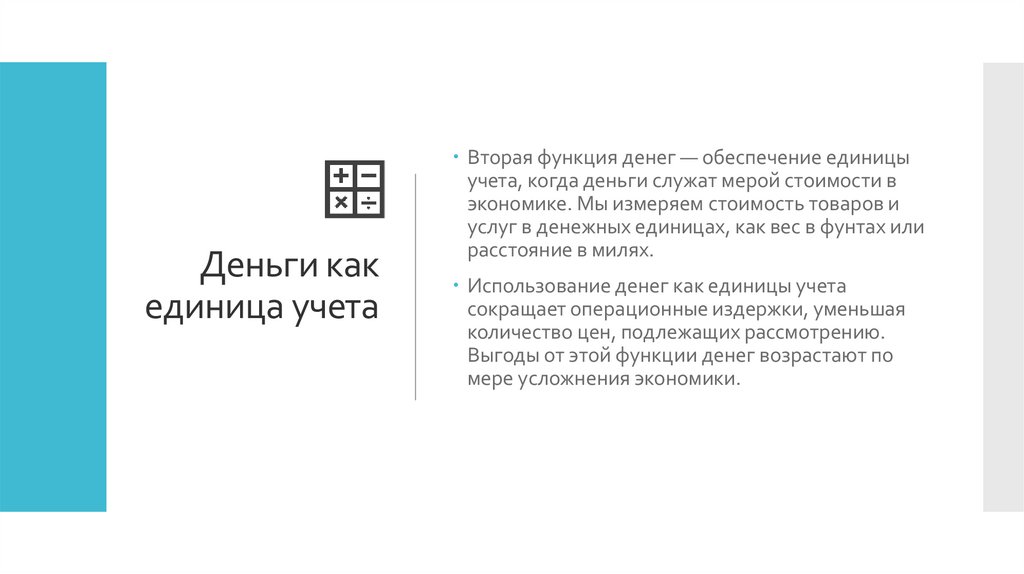 Деньги — средство обмена, единица учета и