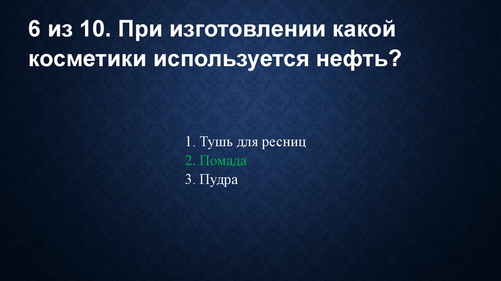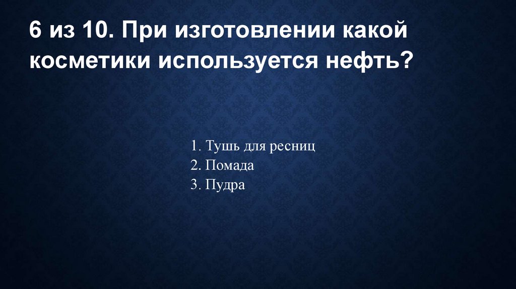 6 из 10. При изготовлении какойкосметики используется нефть?