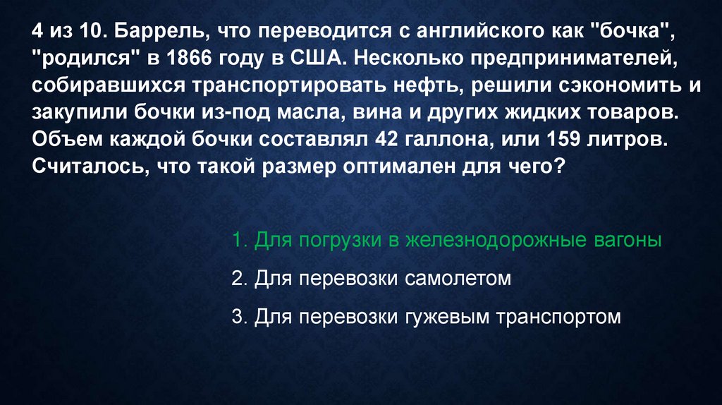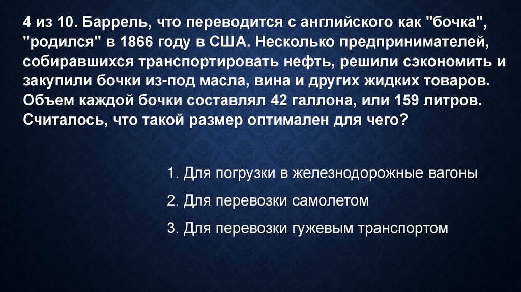 4 из 10. Баррель, что переводится с английского как "бочка","родился" в 1866 году в США. Несколько предпринимателей,