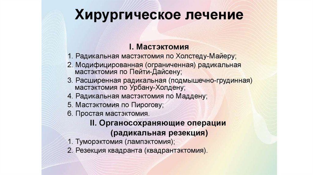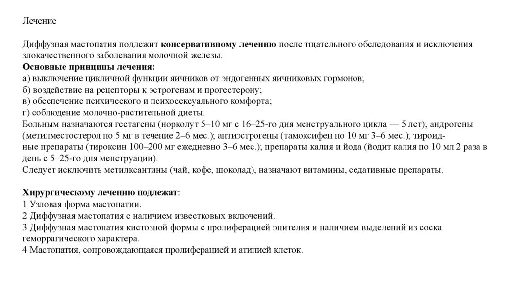 (метилместостерол по 5 мг в течение 2–6 мес.); антиэстрогены (тамоксифен по 10 мг 3–6 мес.); тироидные препараты (тироксин 100–200 мг ежедневно 3–6 мес.); препараты калия и йода (йодит калия по 10 мл 2 раза в
