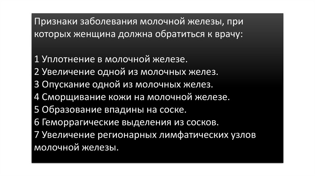 Признаки заболевания молочной железы, прикоторых женщина должна обратиться к врачу: