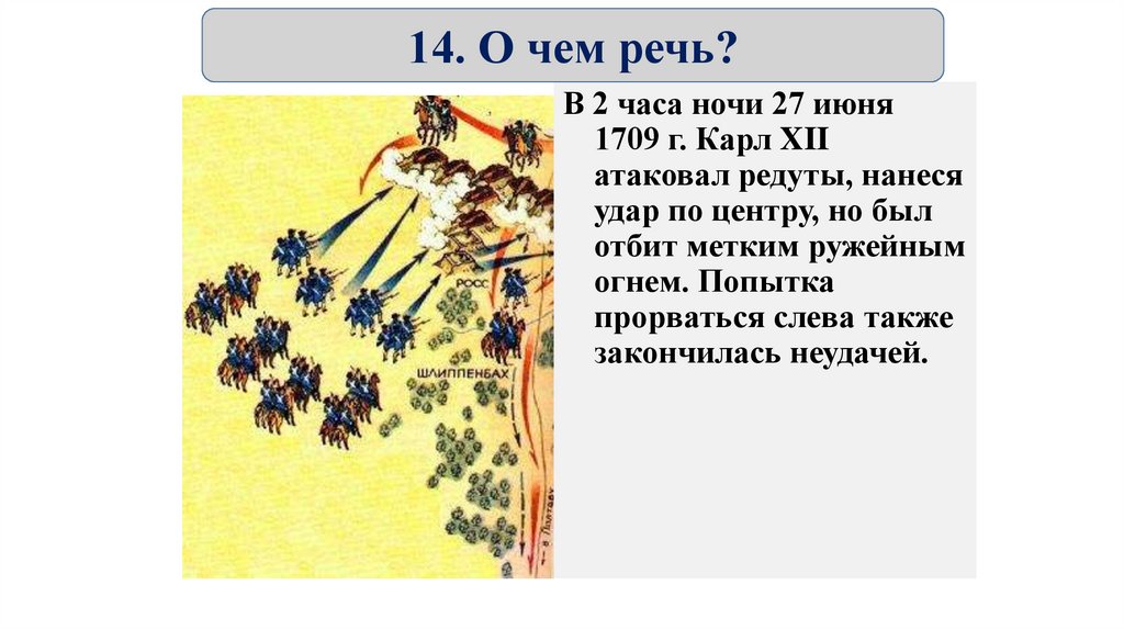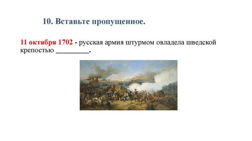 10. Вставьте пропущенное.11 октября 1702 - русская армия штурмом овладела шведской