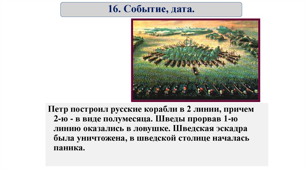 16. Событие, дата.Петр построил русские корабли в 2 линии, причем