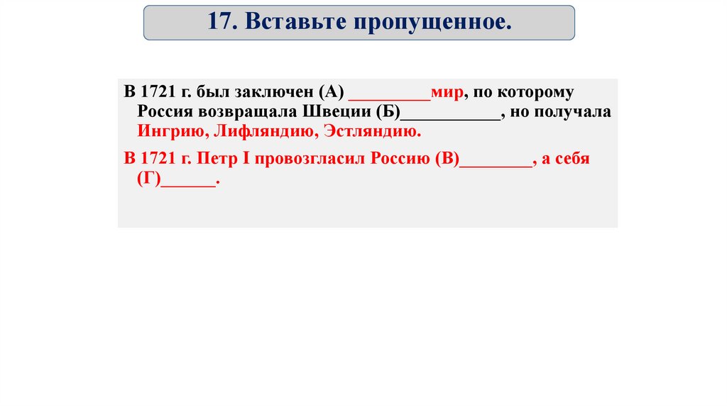 17. Вставьте пропущенное.В 1721 г. был заключен (А) _________мир, по которому