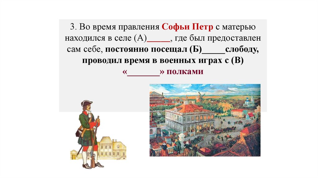 3. Во время правления Софьи Петр с матерьюнаходился в селе (А)_____, где был предоставлен