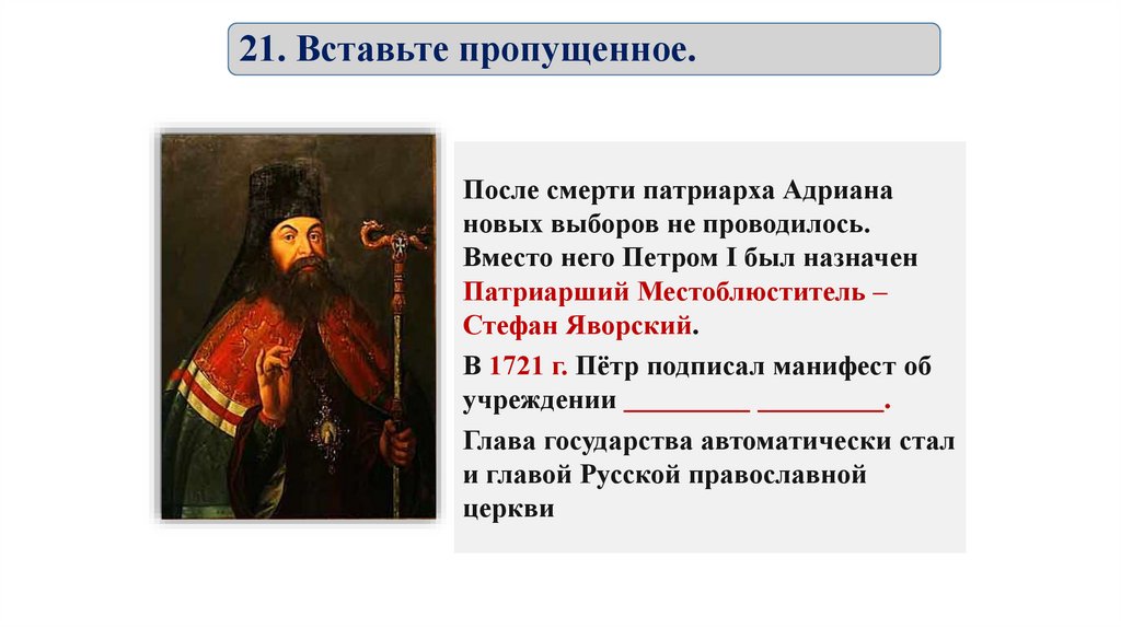 21. Вставьте пропущенное.После смерти патриарха Адриана