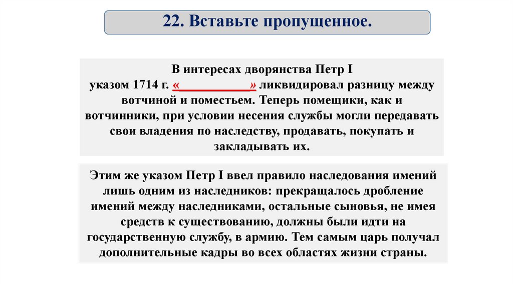 22. Вставьте пропущенное.В интересах дворянства Петр I