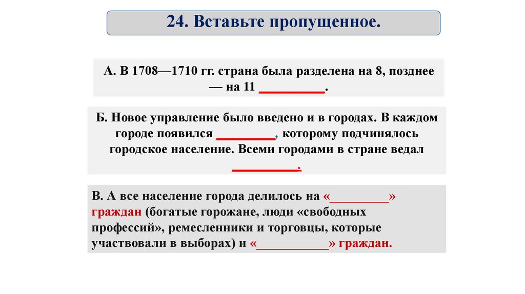 24. Вставьте пропущенное.А. В 1708—1710 гг. страна была разделена на 8, позднее