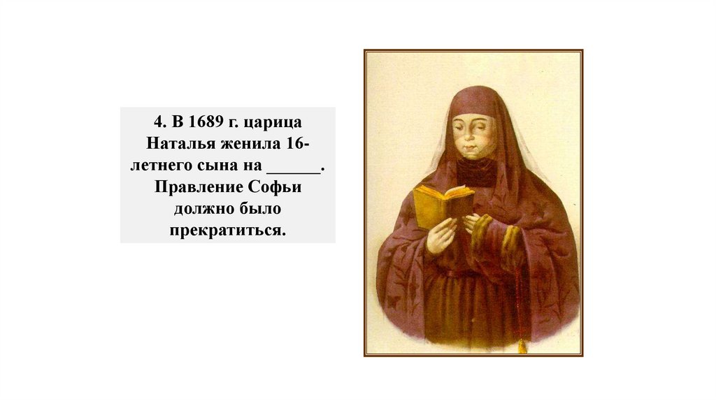 4. В 1689 г. царицаНаталья женила 16летнего сына на ______.