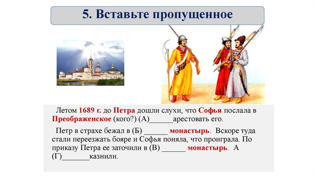 5. Вставьте пропущенноеЛетом 1689 г. до Петра дошли слухи, что Софья послала в