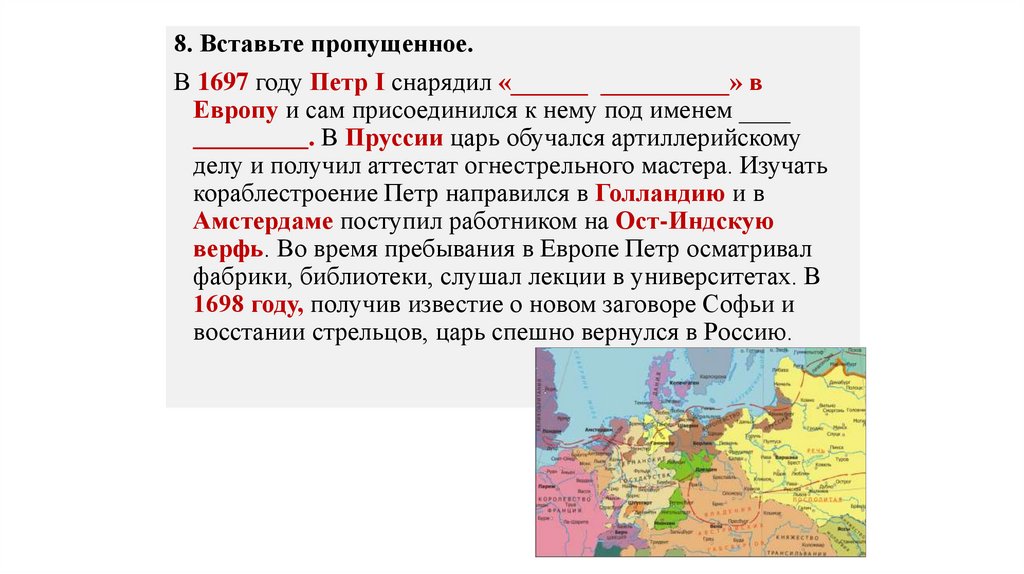 8. Вставьте пропущенное.В 1697 году Петр I снарядил «______ __________» в