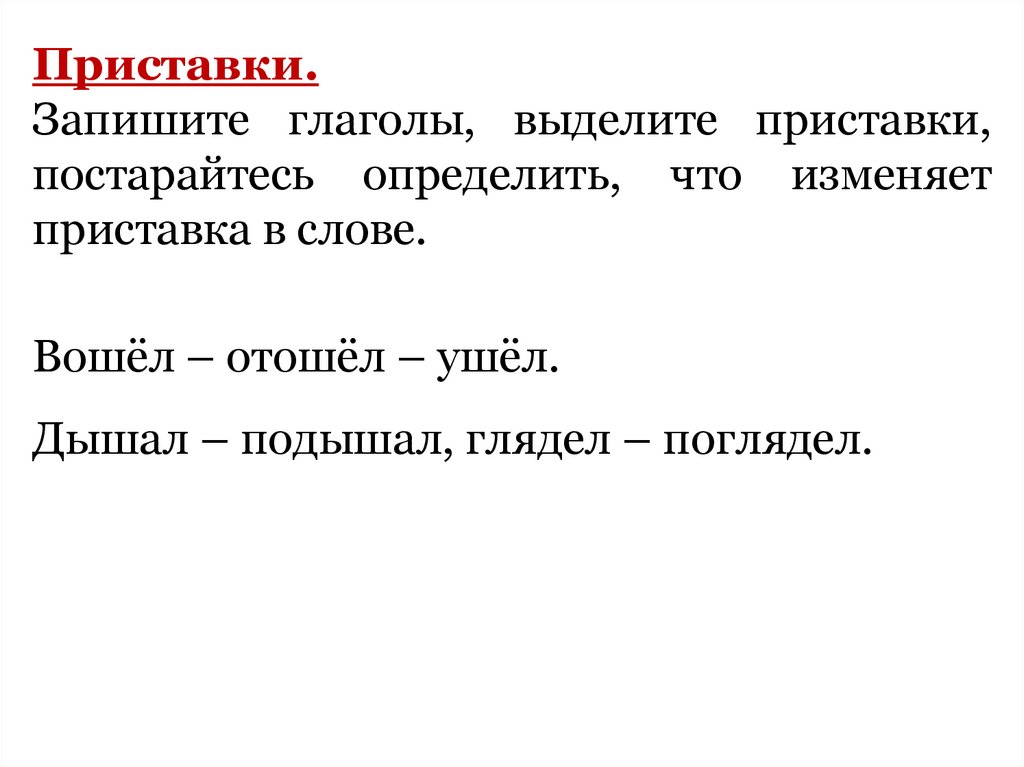 Приставки.Запишите глаголы, выделите приставки,