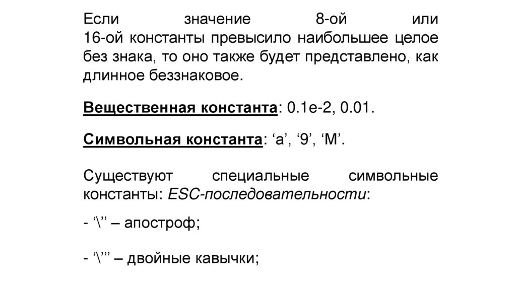 Символьная константа: ‘a’, ‘9’, ‘M’.