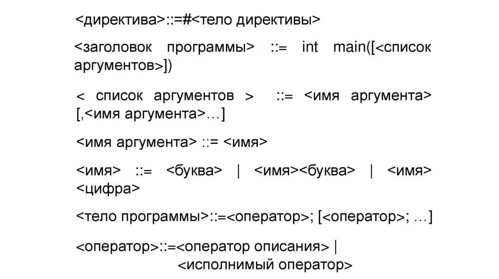 <директива>::=#<тело директивы><заголовок программы> ::= int main([<список