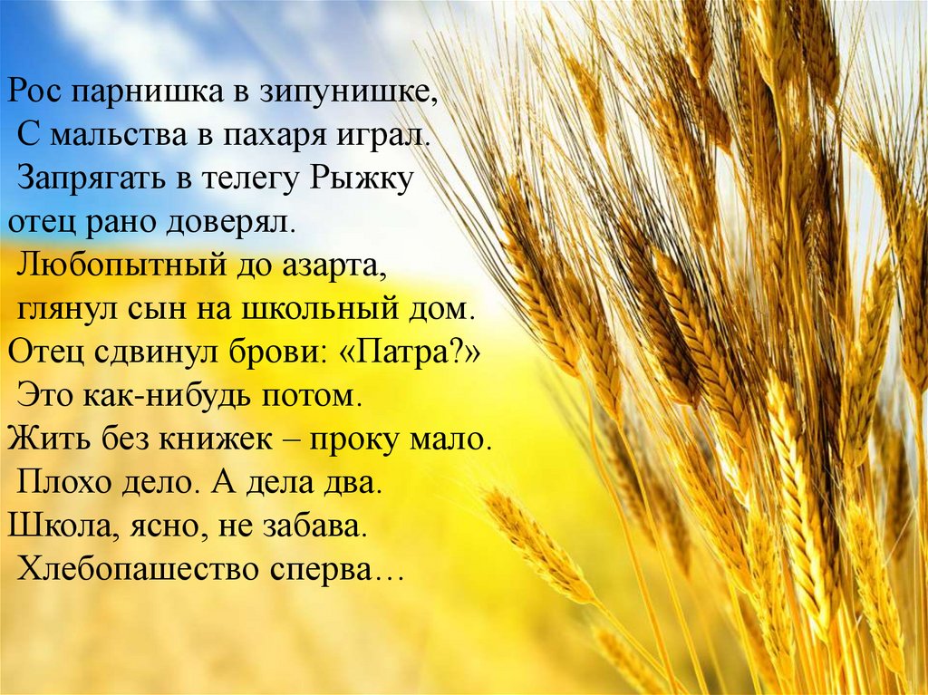 Рос парнишка в зипунишке,С мальства в пахаря играл.