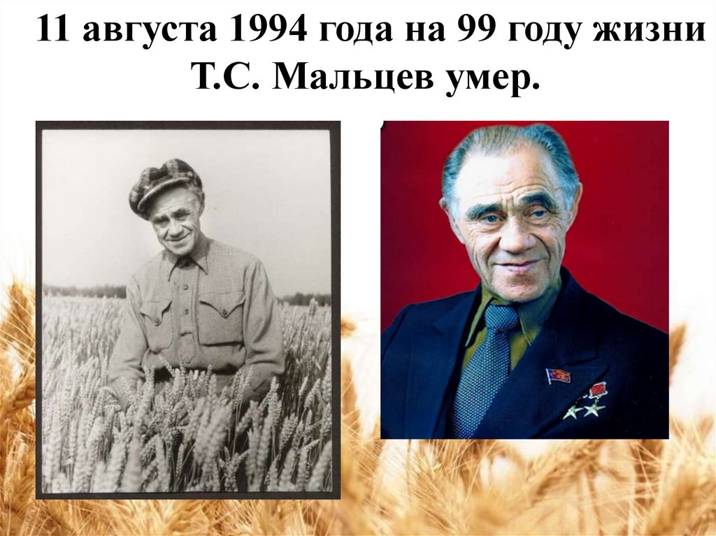 11 августа 1994 года на 99 году жизниТ.С. Мальцев умер.