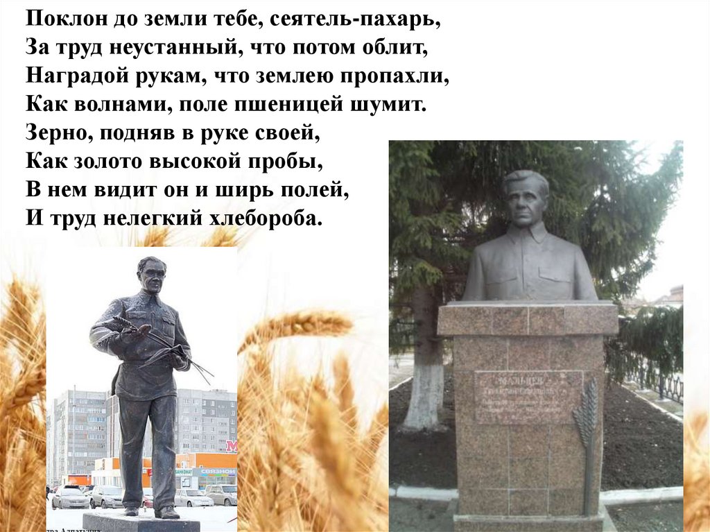 Поклон до земли тебе, сеятель-пахарь,За труд неустанный, что потом облит,