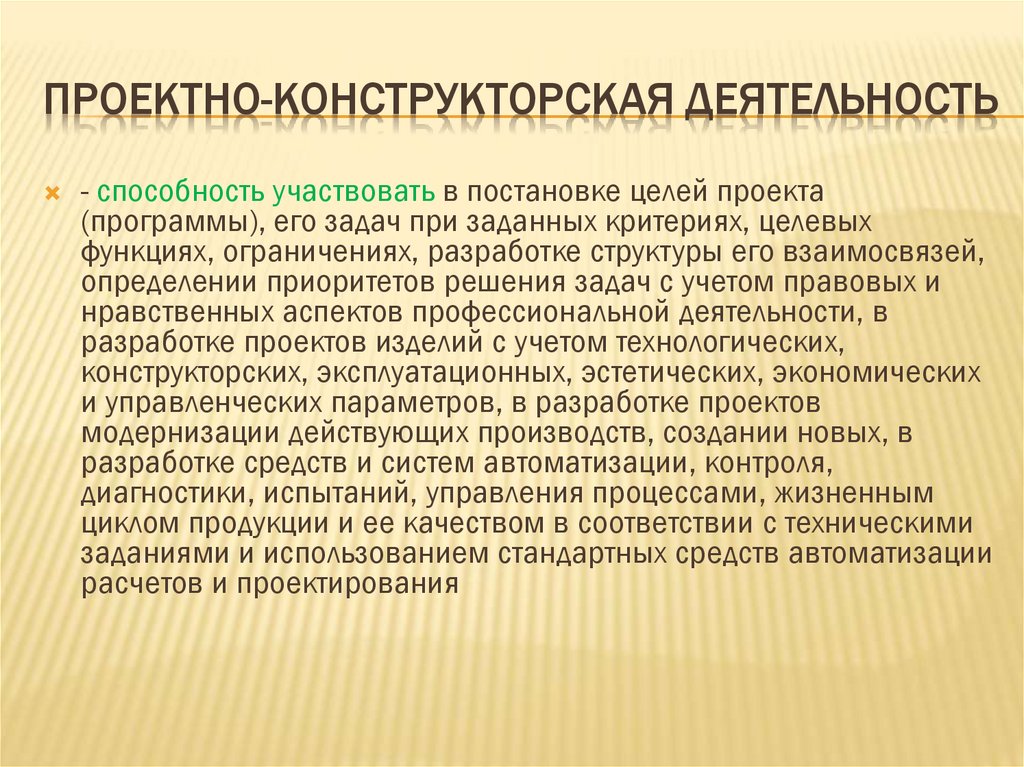 ПРОЕКТНО-КОНСТРУКТОРСКАЯ ДЕЯТЕЛЬНОСТЬ- способность участвовать в постановке целей проекта