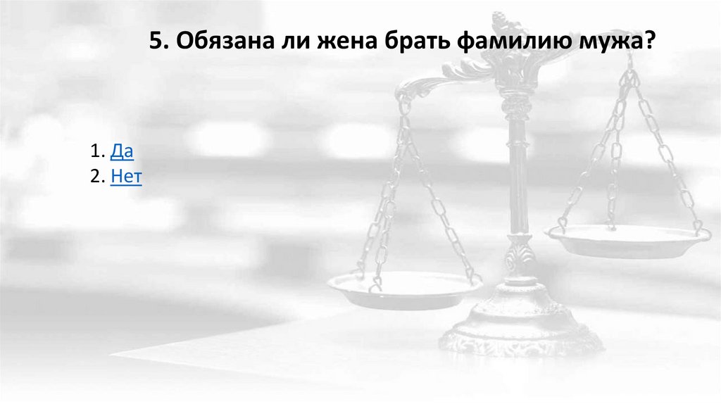 5. Обязана ли жена брать фамилию мужа?1. Да