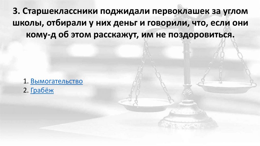 3. Старшеклассники поджидали первоклашек за угломшколы, отбирали у них деньг и говорили, что, если они