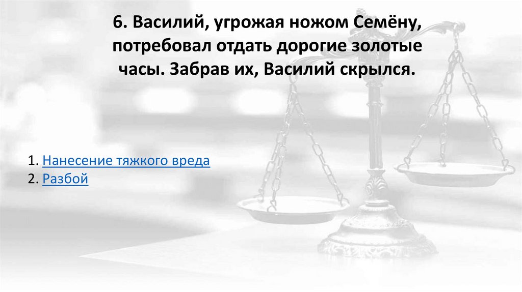6. Василий, угрожая ножом Семёну,потребовал отдать дорогие золотые